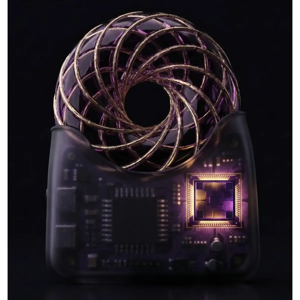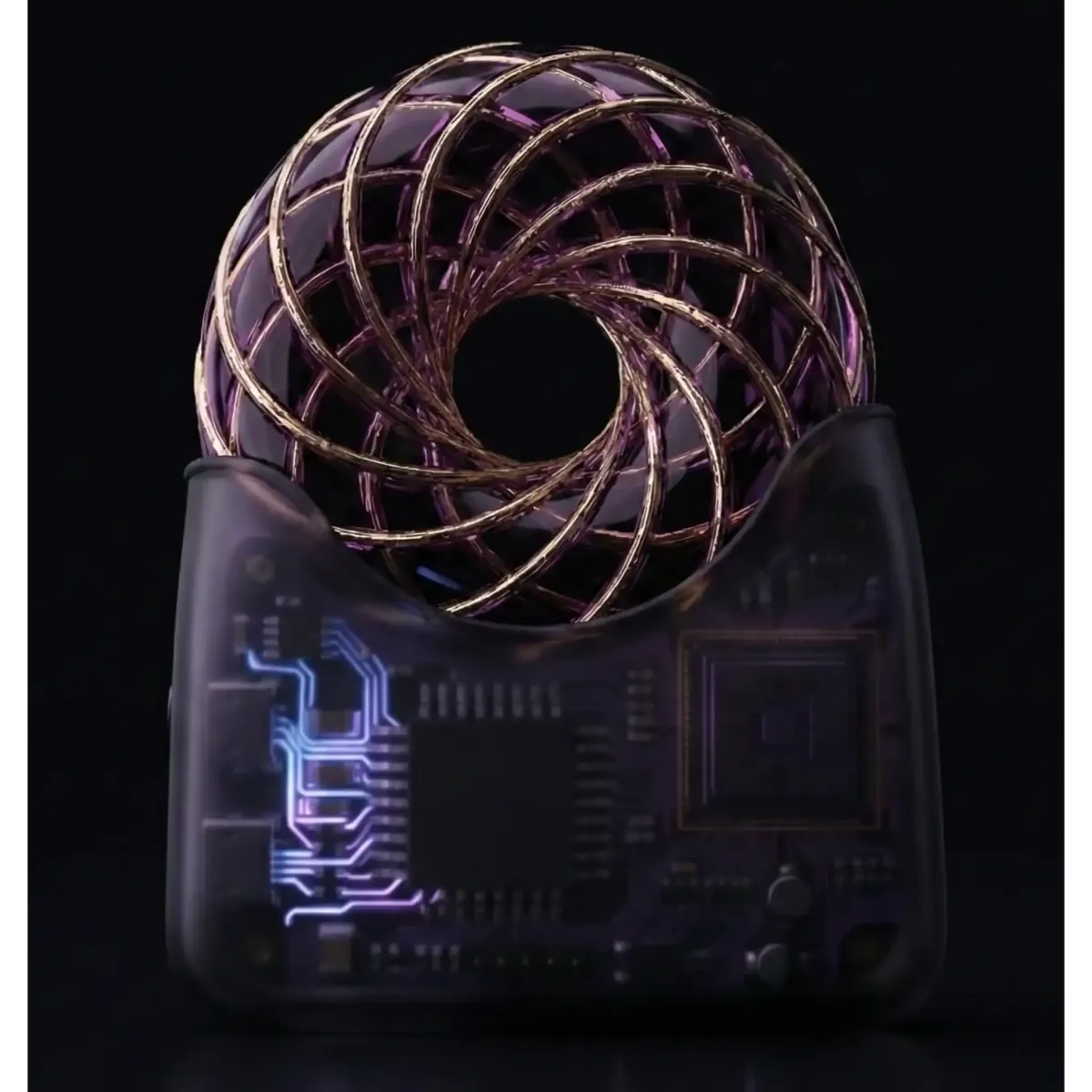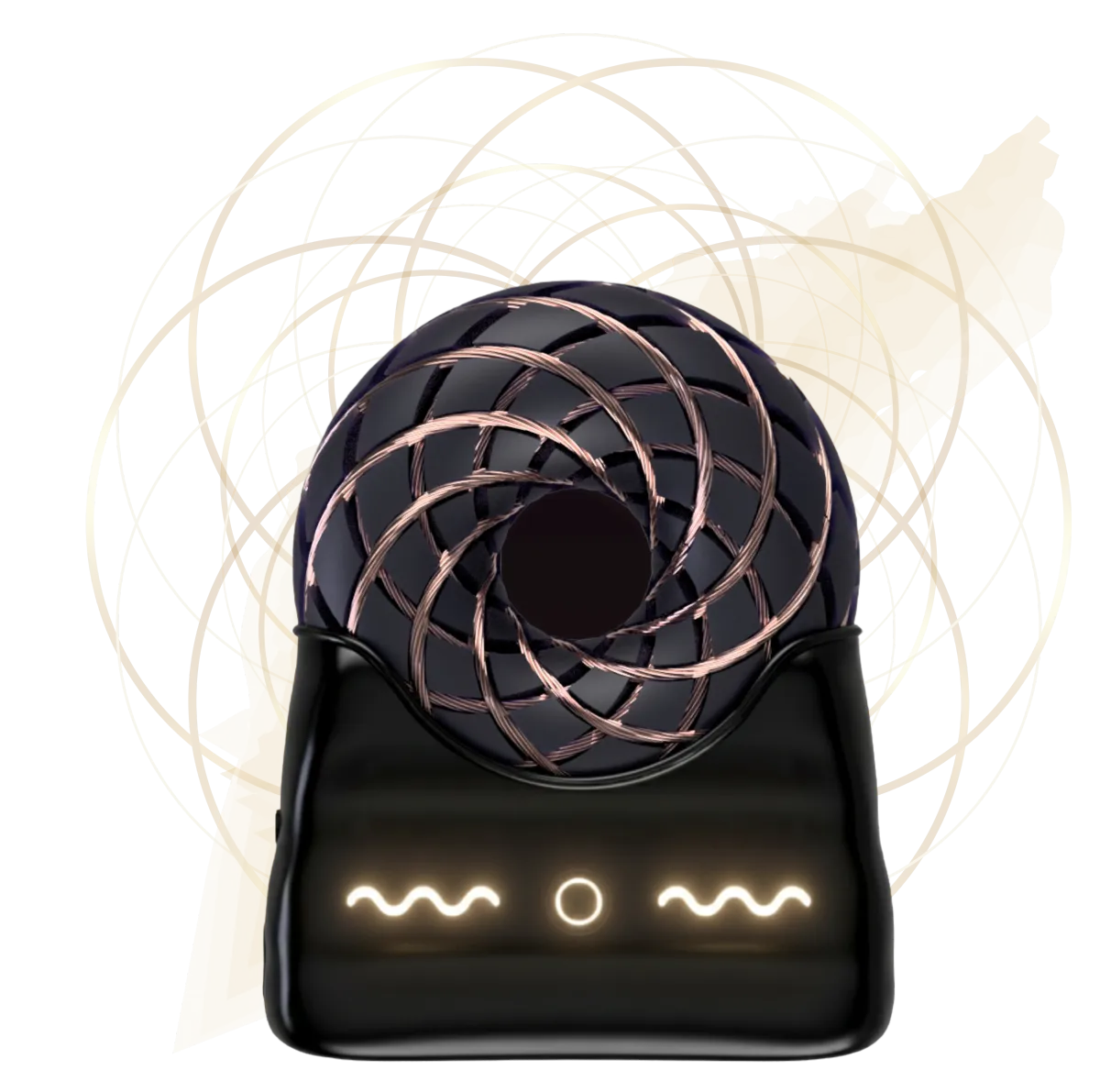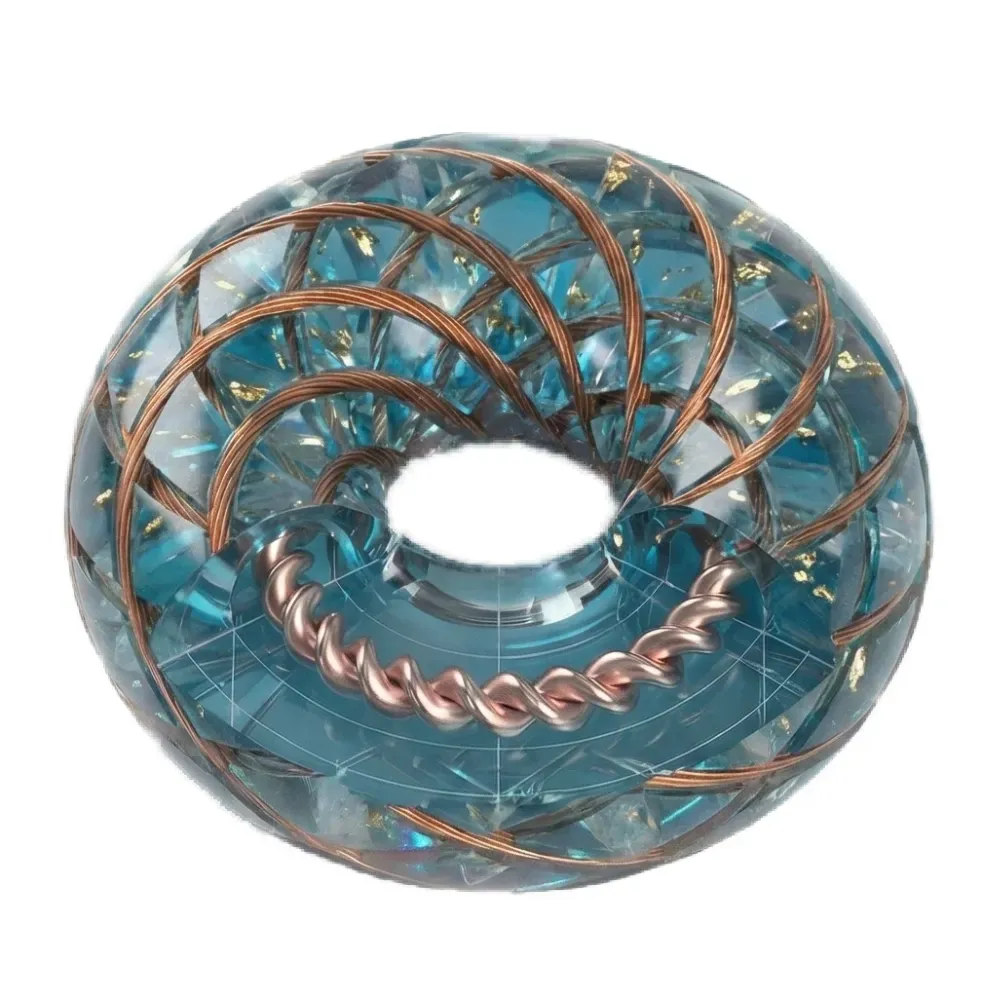 A twisted copper ring that acts as a portal for life-force energy. This technology creates a potent, concentrated field that stabilizes and amplifies the positive output of the device.